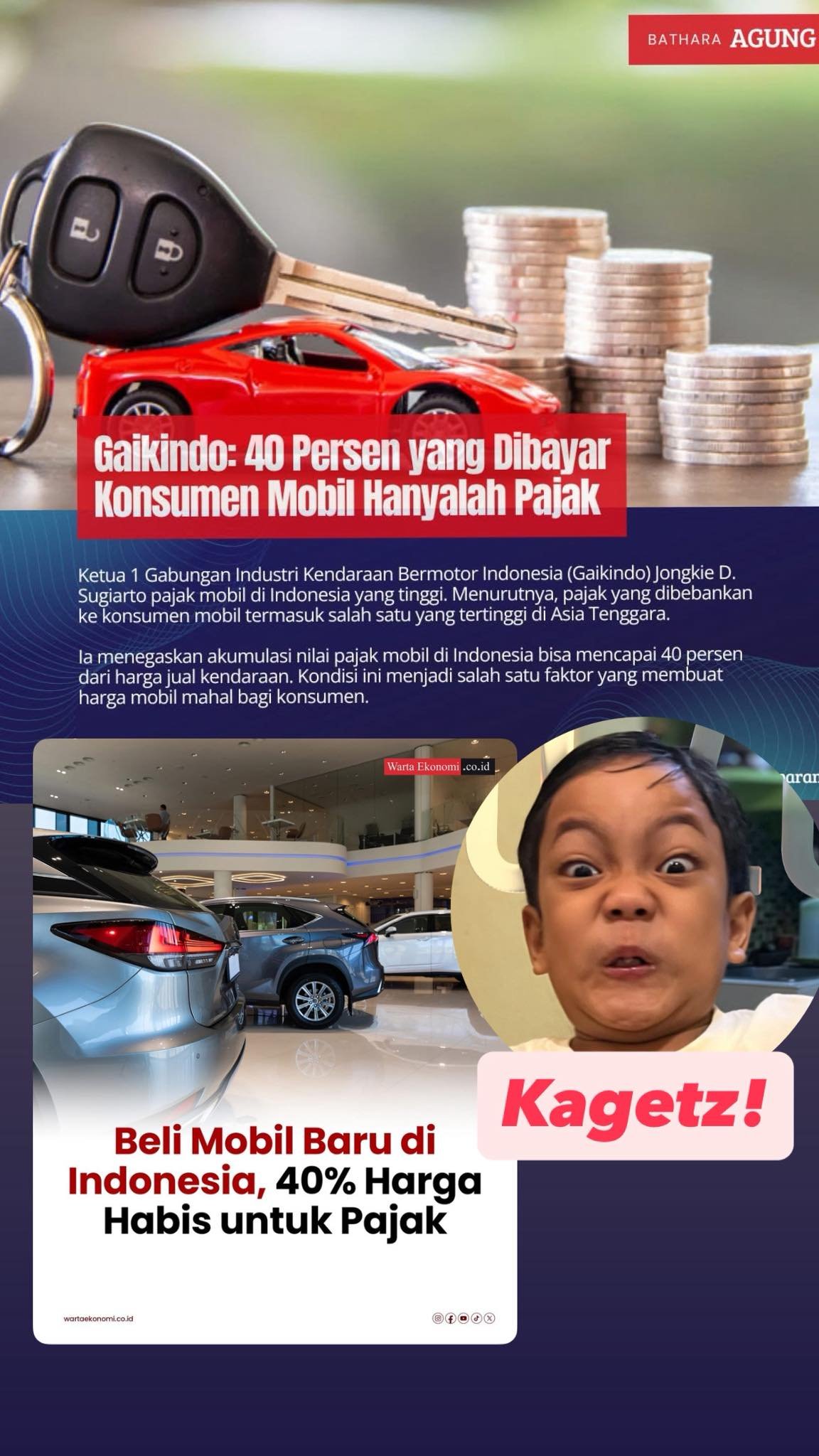 - Membeli mobil baru di Indonesia berarti konsumen harus menanggung beban pajak setidaknya 40 persen yang dipungut pemerintah pusat dan daerah.