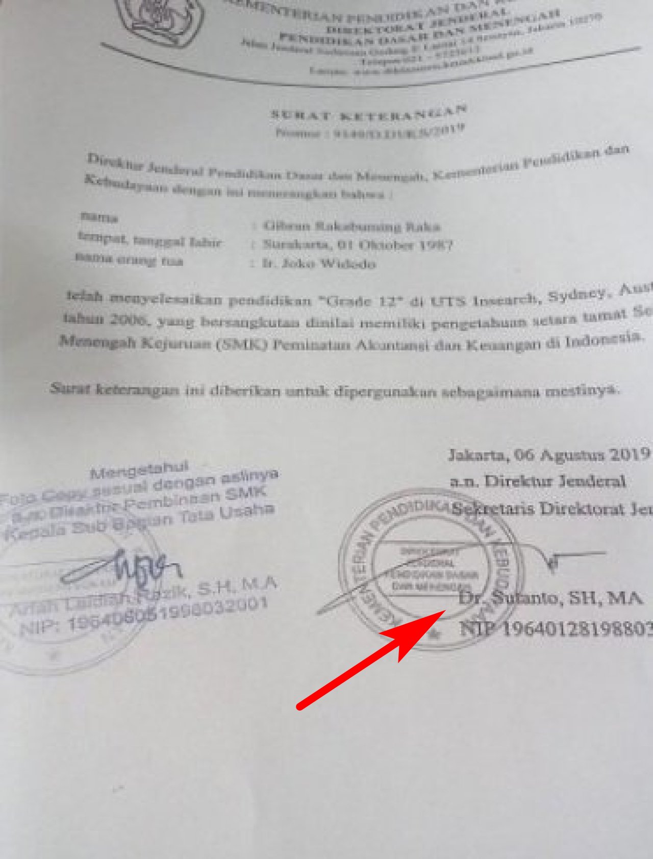 Dr. Sutanto, SH, MA, mantan Sekretaris Dirjen Dikdasmen, inilah yang menandatangani Surat Keterangan penyetaraan Gibran Rakabuming Raka setara lulusan SMK pada tahun 2019.