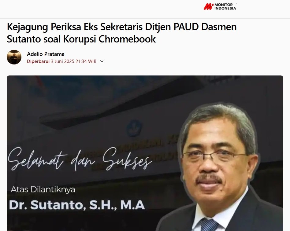 Kejaksaan Agung (Kejagung) melalui Tim Jaksa Penyidik pada Direktorat Penyidikan Jaksa Agung Muda Bidang Tindak Pidana Khusus (Jampidsus) memeriksa Sekretaris Direktorat Jenderal Paud, Pendidikan Dasar dan Menengah (Paud Dikdasmen) tahun 2019, Sutanto (STN) sebagai saksi kasus dugaan korupsi pada Kementerian Pendidikan, Budaya, Riset Teknologi dalam Program Digitalisasi Pendidikan atau proyek pengadaan laptop berbasis ChromeOS/Chromebook tahun 2019 sampai dengan 2022, Selasa (3/6/2025).