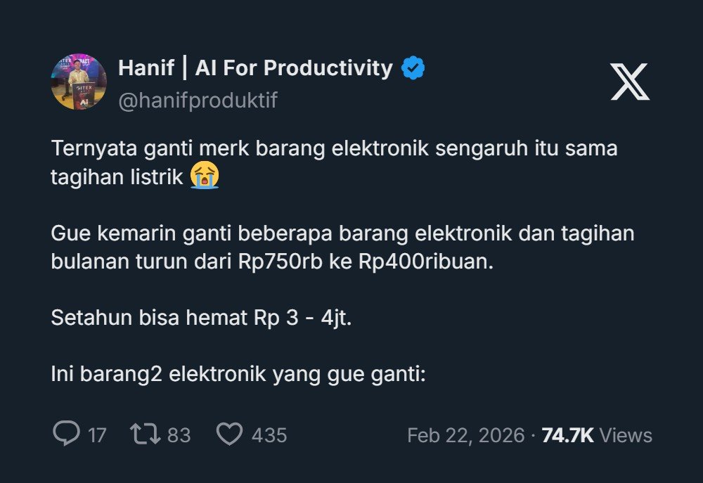 Gue kemarin ganti beberapa barang elektronik dan tagihan bulanan turun dari Rp750rb ke Rp400ribuan.