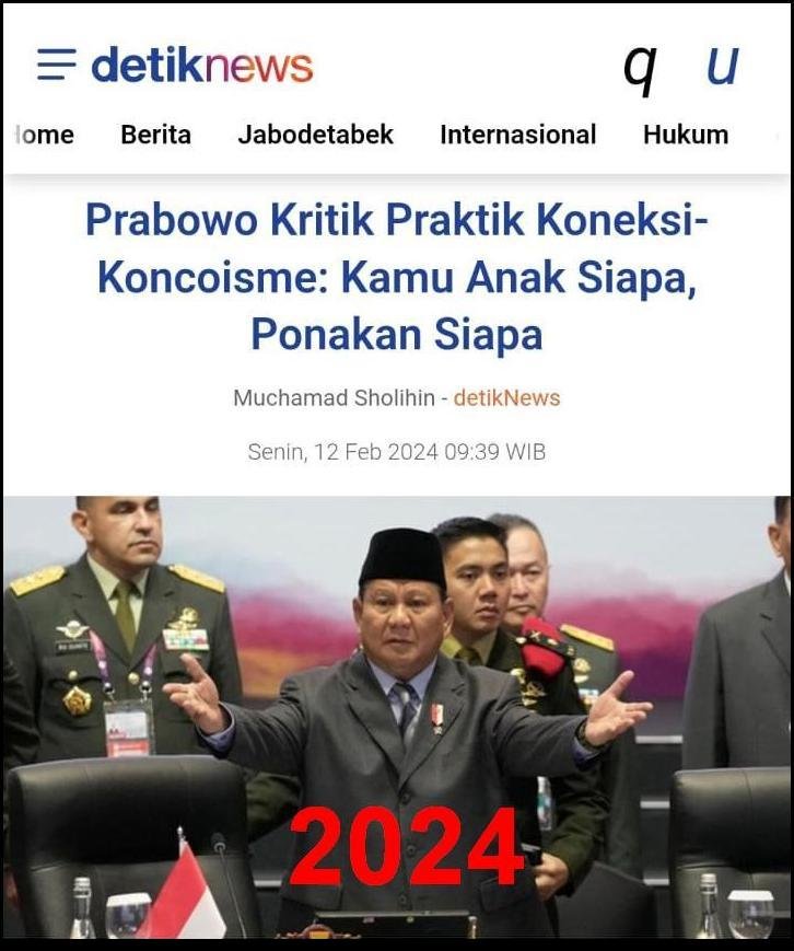 Berita ini misalnya, tahun 2024 lalu, Pak Prabowo dengan lantang mengkritik praktik koncoisme dan nepotisme.