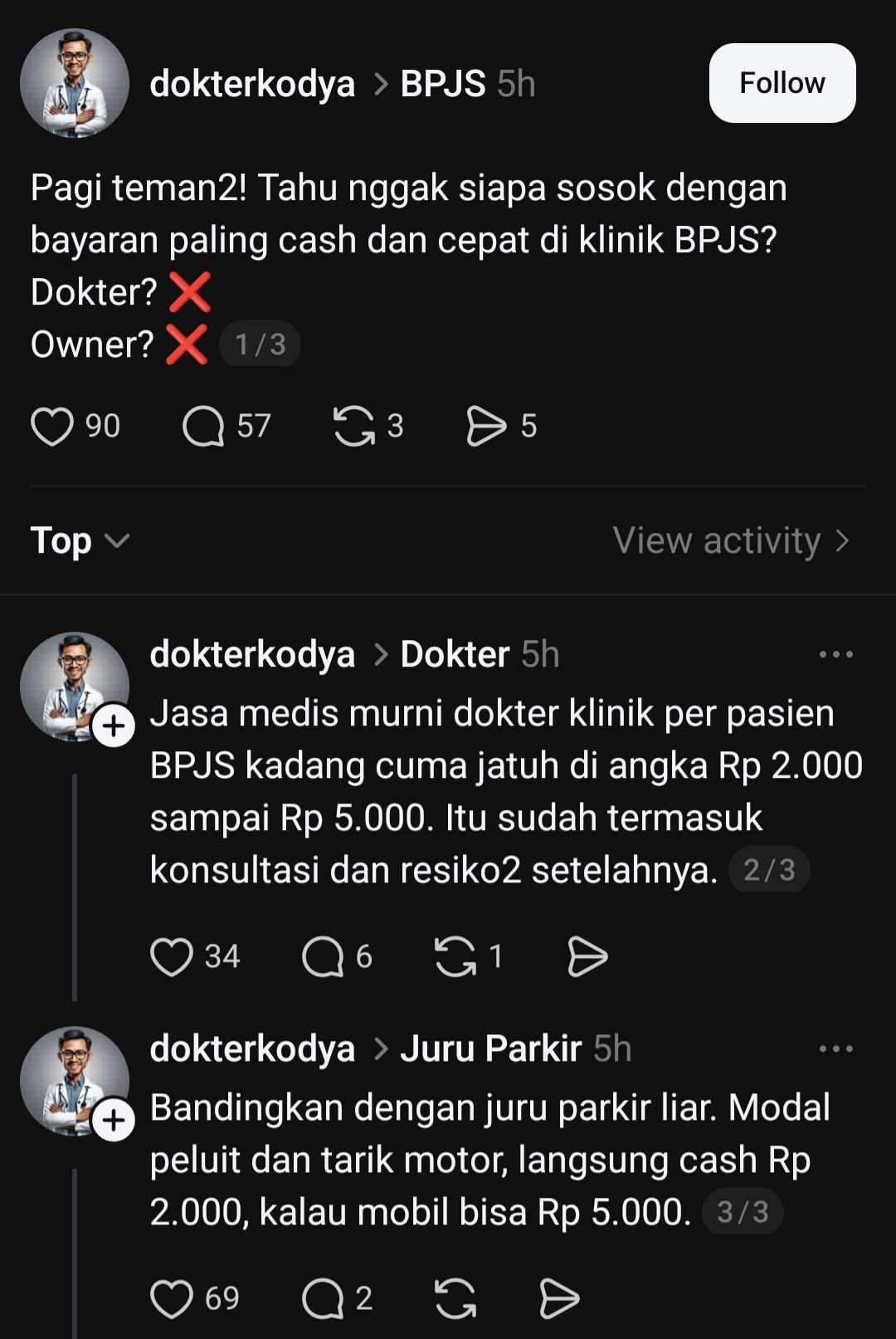 Jasa medis murni dokter klinik per pasien BPJS kadang cuma jatuh di angka Rp 2.000 sampai Rp 5.000. Itu sudah termasuk konsultasi dan resiko2 setelahnya.