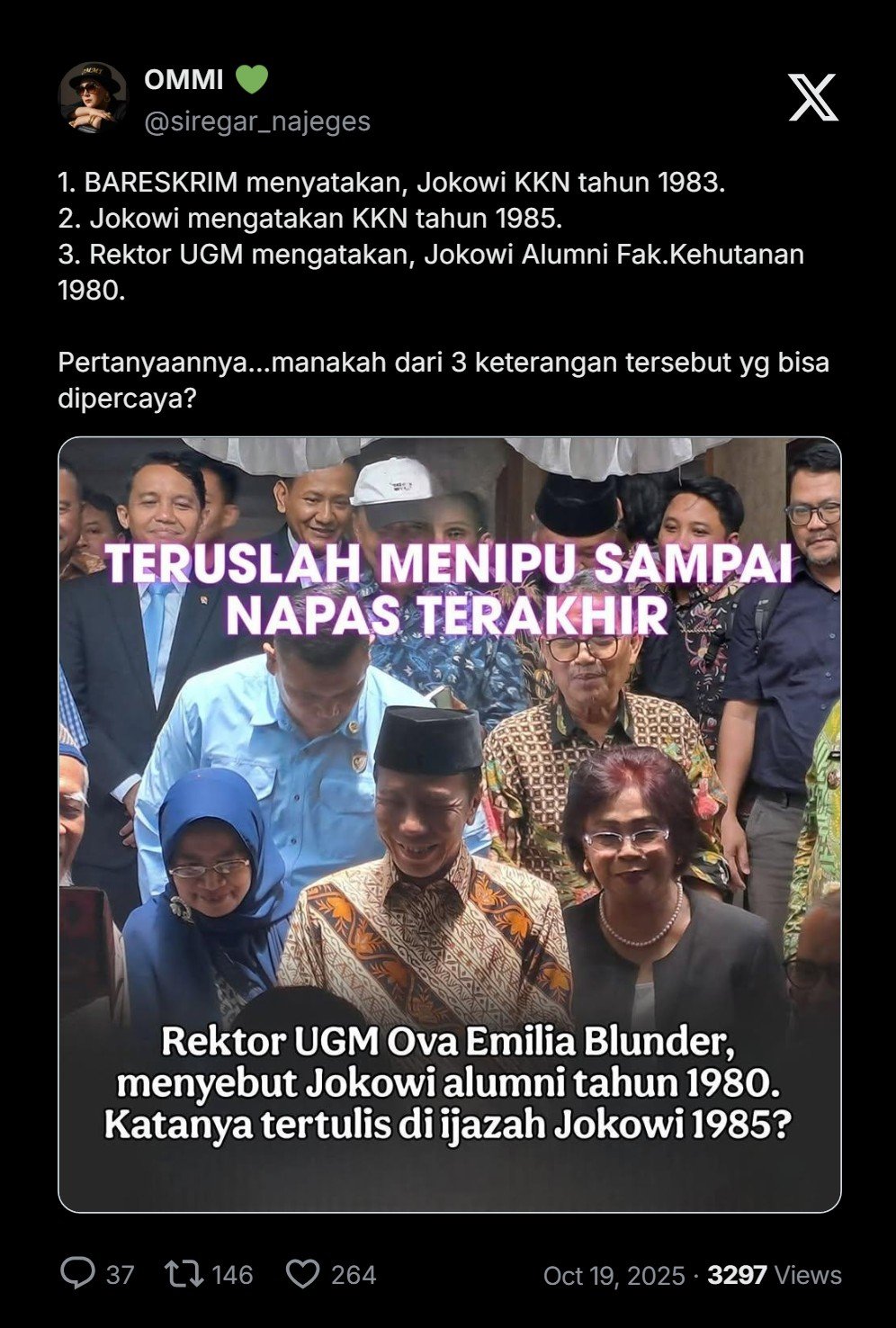 - Rektor UGM mengatakan, Jokowi Alumni Fak. Kehutanan 1980.