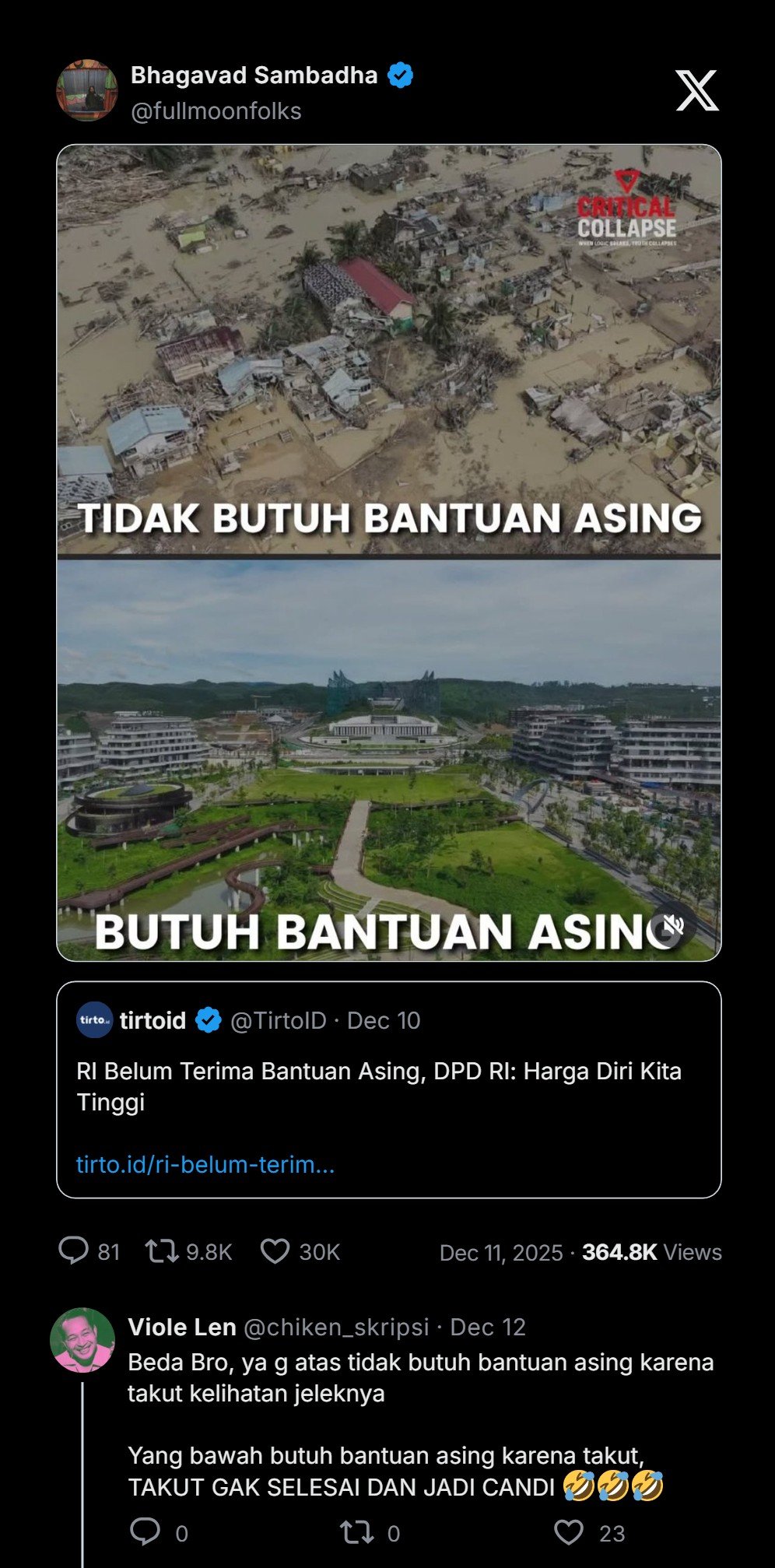 Sementara, banyak yang mendesak agar pemerintah segera membuka keran bagi bantuan asing guna mempercepat proses penanganan bencana.