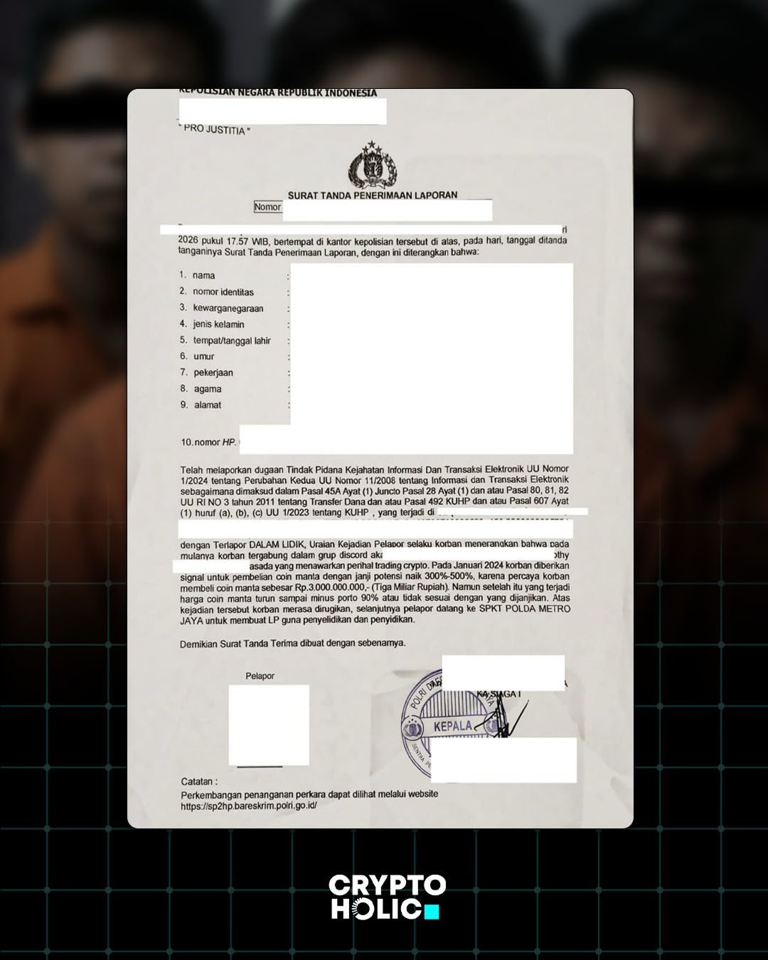 Selain itu, akun @cryptoholic.idn mengunggah foto tanda bukti laporan polisi yang diterbitkan Polda Metro Jaya.