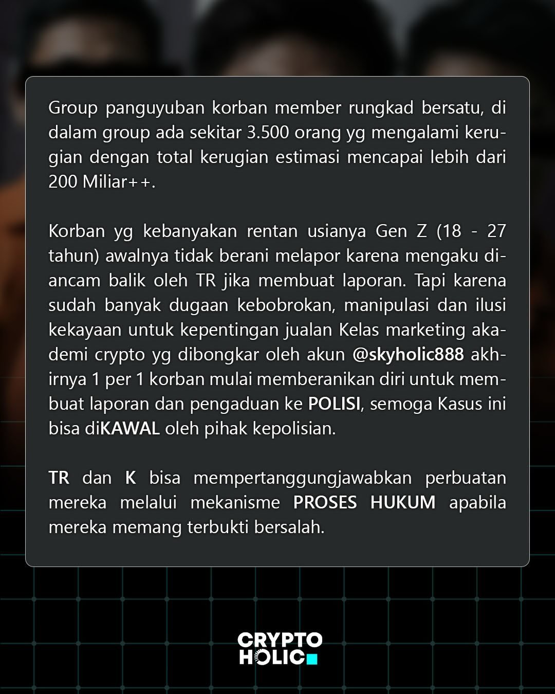 Informasi mengenai dugaan penipuan trading kripto ini sebelumnya muncul melalui unggahan akun Instagram @cryptoholic.idn. Dalam unggahannya, akun tersebut menyebut pendiri Akademi Crypto, Timothy Ronald, bersama seorang trader kripto bernama Kalimasada telah dilaporkan ke polisi.