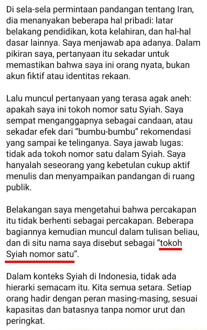 Lalu muncul pertanyaan yang terasa agak aneh: apakah saya ini tokoh nomor satu Syiah. Saya sempat menganggapnya sebagai candaan, atau sekadar efek dari “bumbu-bumbu” rekomendasi yang sampai ke telinganya. Saya jawab lugas: tidak ada tokoh nomor satu dalam Syiah. Saya hanyalah seseorang yang kebetulan cukup aktif menulis dan menyampaikan pandangan di ruang publik.