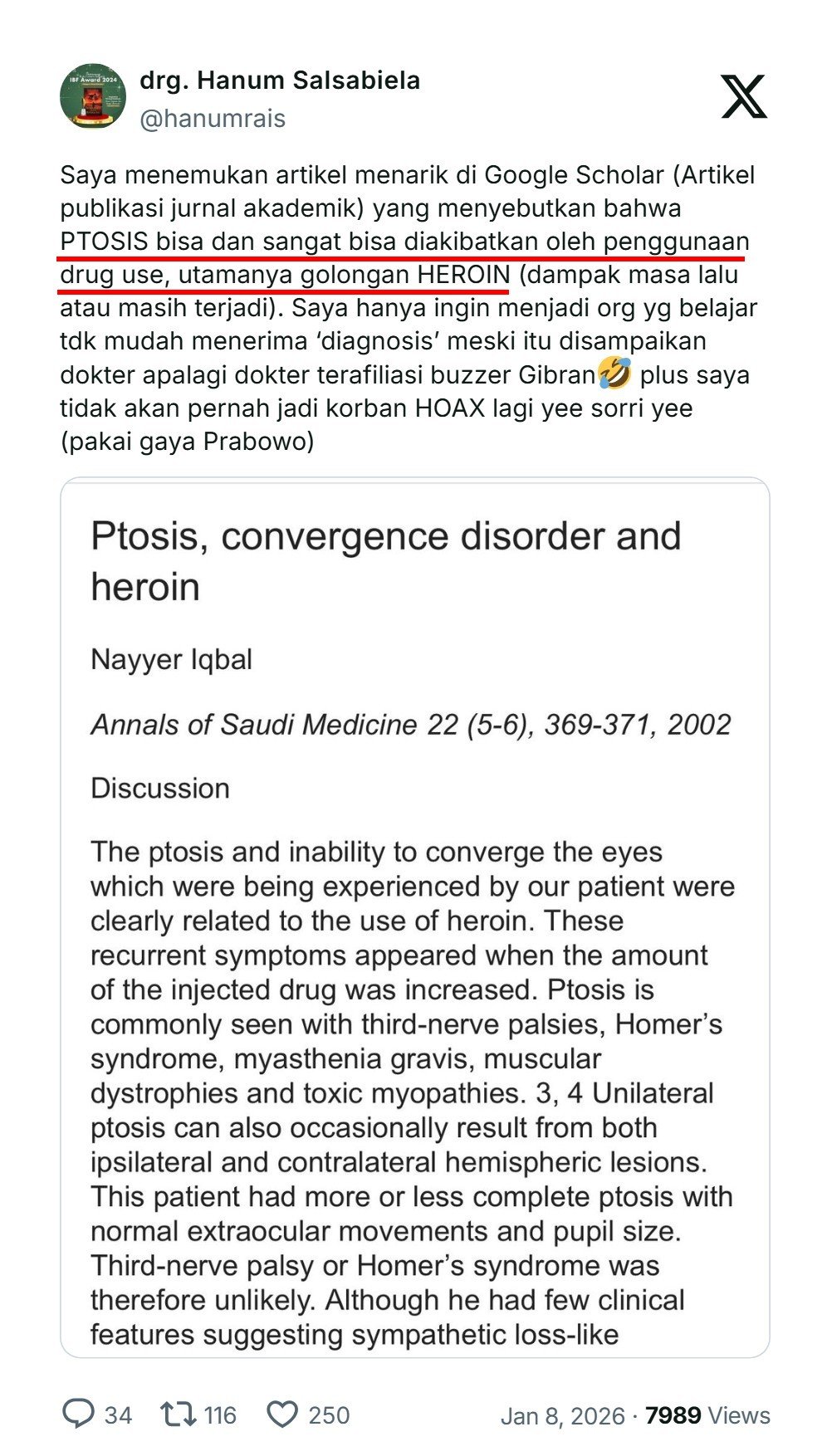 Jadi, Gibran lebih suka disebut Ngantukan sama Panji atau Ptosis sama dr Tompi?” ujar Dokter Tifa di akun media sosialnya di X.