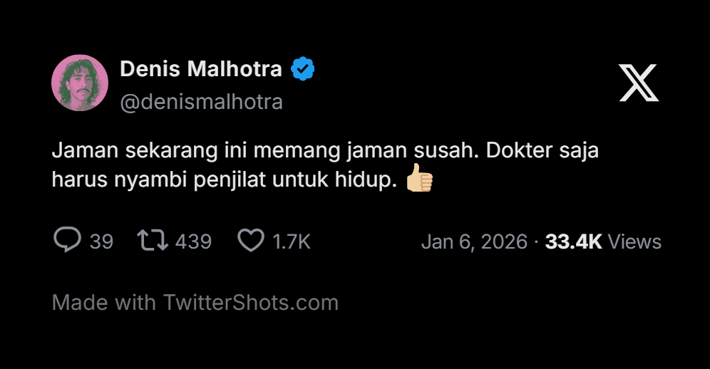 “Jaman sekarang ini memang jaman susah. Dokter saja harus nyambi penjilat untuk hidup. 👍🏼,” sentil Denis Malhotra @denismalhotra.