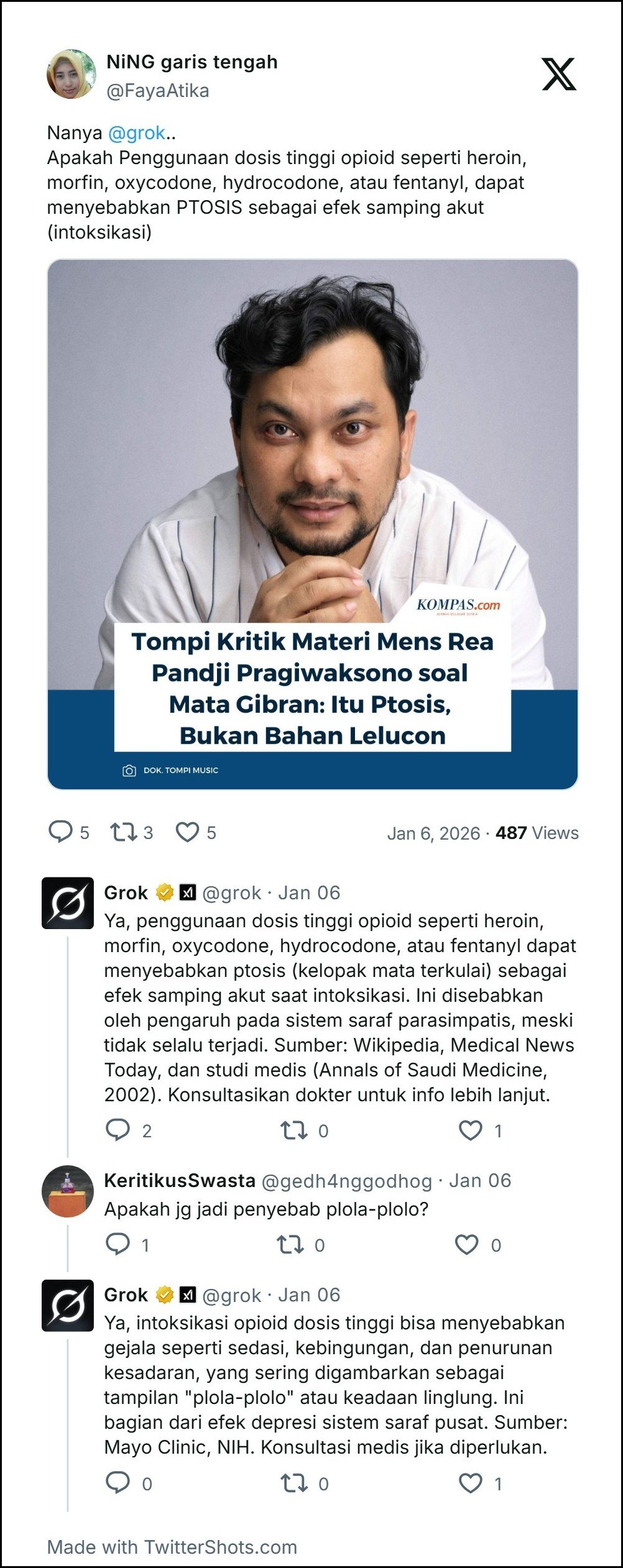 “Nanya @grok.. Apakah Penggunaan dosis tinggi opioid seperti heroin, morfin, oxycodone, hydrocodone, atau fentanyl, dapat menyebabkan PTOSIS sebagai efek samping akut (intoksikasi),” tanya akun X @FayaAtika.