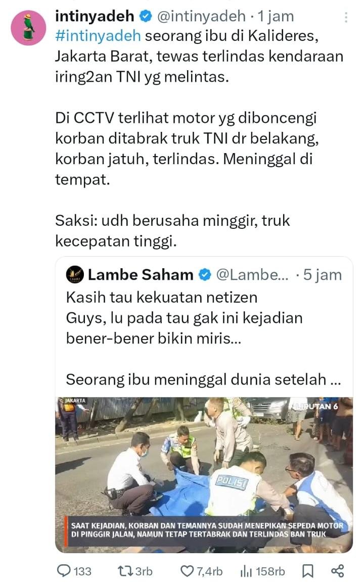 Tragedi kecelakaan maut yang melibatkan iring-iringan truk TNI terjadi di kawasan Kalideres, Jakarta Barat, pada Jumat pagi, 3 April 2026. Insiden ini mengakibatkan seorang ibu rumah tangga berinisial AM (51) atau dikenal sebagai Ani, meninggal dunia di tempat kejadian.