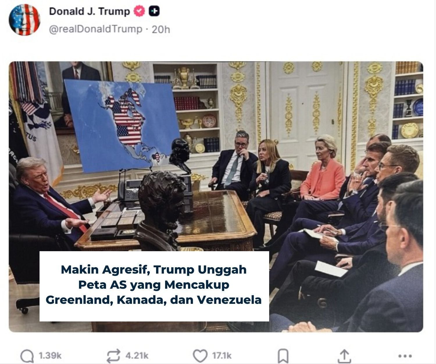 Peta dalam unggahan terbaru Trump kemudian menimbulkan spekulasi luas karena menampilkan wilayah negara lain seolah-olah menjadi bagian dari Amerika Serikat.
