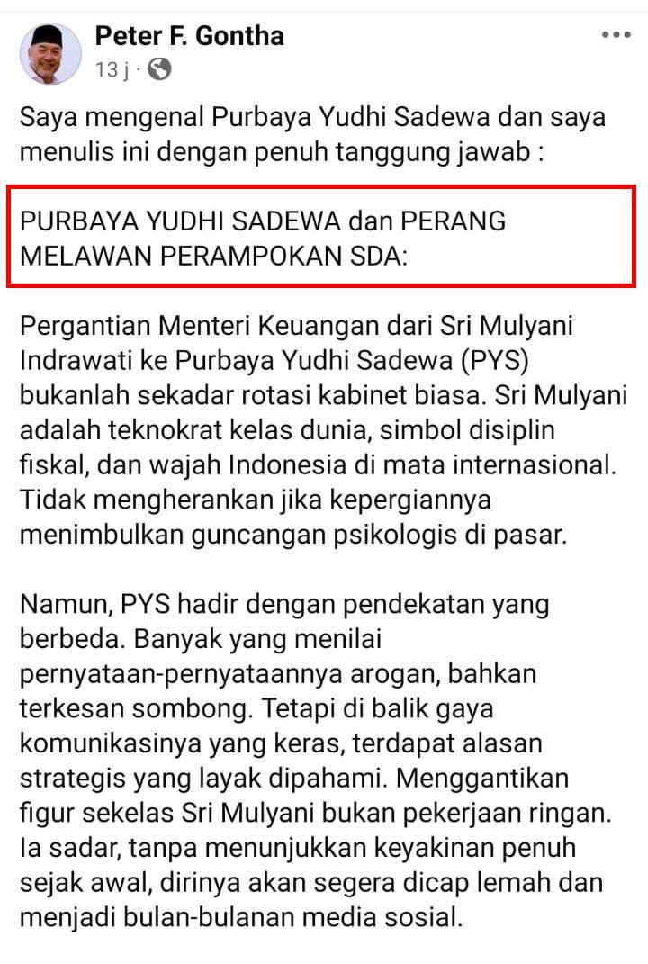 🔴Tulisan menarik Peter F. Gontha tentang Menteri Keuangan yang baru. SEMOGA APA YG DISAMPAIKAN PETER F GONTHA INI TERWUJUD.