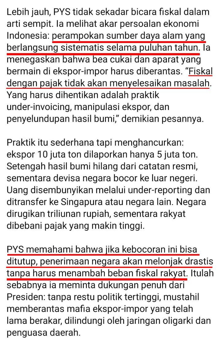 Lebih jauh, PYS tidak sekadar bicara fiskal dalam arti sempit. Ia melihat akar persoalan ekonomi Indonesia: perampokan sumber daya alam yang berlangsung sistematis selama puluhan tahun. Ia menegaskan bahwa bea cukai dan aparat yang bermain di ekspor-impor harus diberantas. “Fiskal dengan pajak tidak akan menyelesaikan masalah. Yang harus dihentikan adalah praktik under-invoicing, manipulasi ekspor, dan penyelundupan hasil bumi,” demikian pesannya.