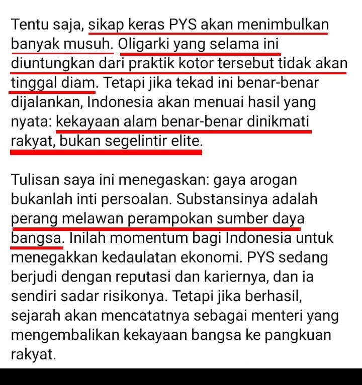 Tulisan saya ini menegaskan: gaya arogan bukanlah inti persoalan. Substansinya adalah perang melawan perampokan sumber daya bangsa. Inilah momentum bagi Indonesia untuk menegakkan kedaulatan ekonomi. PYS sedang berjudi dengan reputasi dan kariernya, dan ia sendiri sadar risikonya. Tetapi jika berhasil, sejarah akan mencatatnya sebagai menteri yang mengembalikan kekayaan bangsa ke pangkuan rakyat.