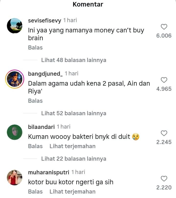 “Uang itu kotor bu banyak kumannya,” komen netizen.