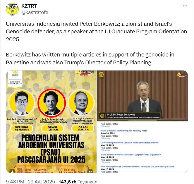 Universitas Indonesia (UI) mengundang Peter Berkowitz; seorang Zionis dan pembela Genosida Israel, sebagai pembicara pada Orientasi Program Pascasarjana UI 2025 pada Sabtu, 23 Agustus 2025.
