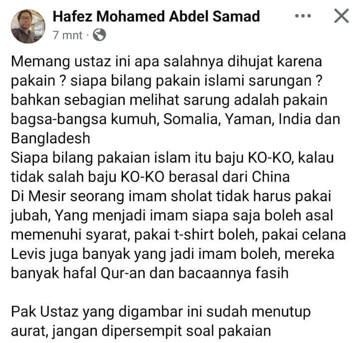 “Memang ustaz ini apa salahnya dihujat karena pakain ? siapa bilang pakain islami sarungan ? bahkan sebagian melihat sarung adalah pakain bagsa-bangsa kumuh, Somalia, Yaman, India dan Bangladesh. Siapa bilang pakaian islam itu baju KO-KO, kalau tidak salah baju KO-K0 berasal dari China. Di Mesir seorang imam sholat tidak harus pakai jubah, Yang menjadi imam siapa saja boleh asal memenuhi syarat, pakai t-shirt boleh, pakai celana Levis juga banyak yang jadi imam boleh, mereka banyak hafal Qur-an dan bacaannya fasih. Pak Ustaz yang digambar ini sudah menutup aurat, jangan dipersempit soal pakaian,” ujar Ustadz Hafez Mohamed Abdel Samad, seorang WNI alumni Al Azhar yang saat ini berdomisili di Mesir.