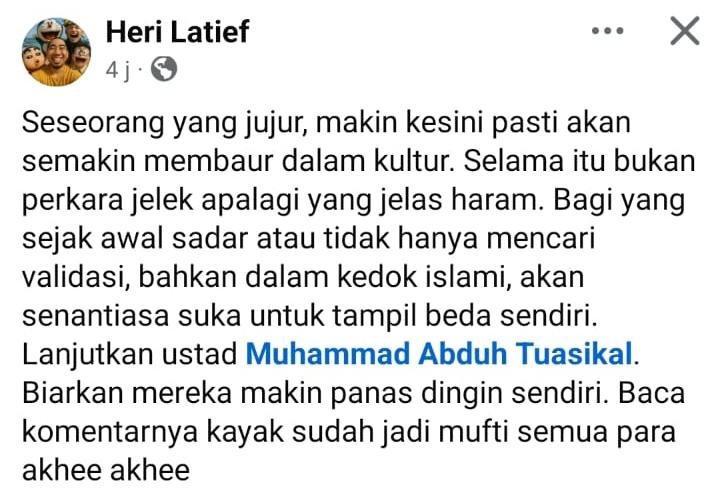 “Seseorang yang jujur, makin kesini pasti akan semakin membaur dalam kultur. Selama itu bukan perkara jelek apalagi yang jelas haram. Bagi yang sejak awal sadar atau tidak hanya mencari validasi, bahkan dalam kedok islami, akan senantiasa suka untuk tampil beda sendiri. Lanjutkan ustad Muhammad Abduh Tuasikal. Biarkan mereka makin panas dingin sendiri. Baca komentarnya kayak sudah jadi mufti semua para akhee akhee,” ujar Heri Latief.