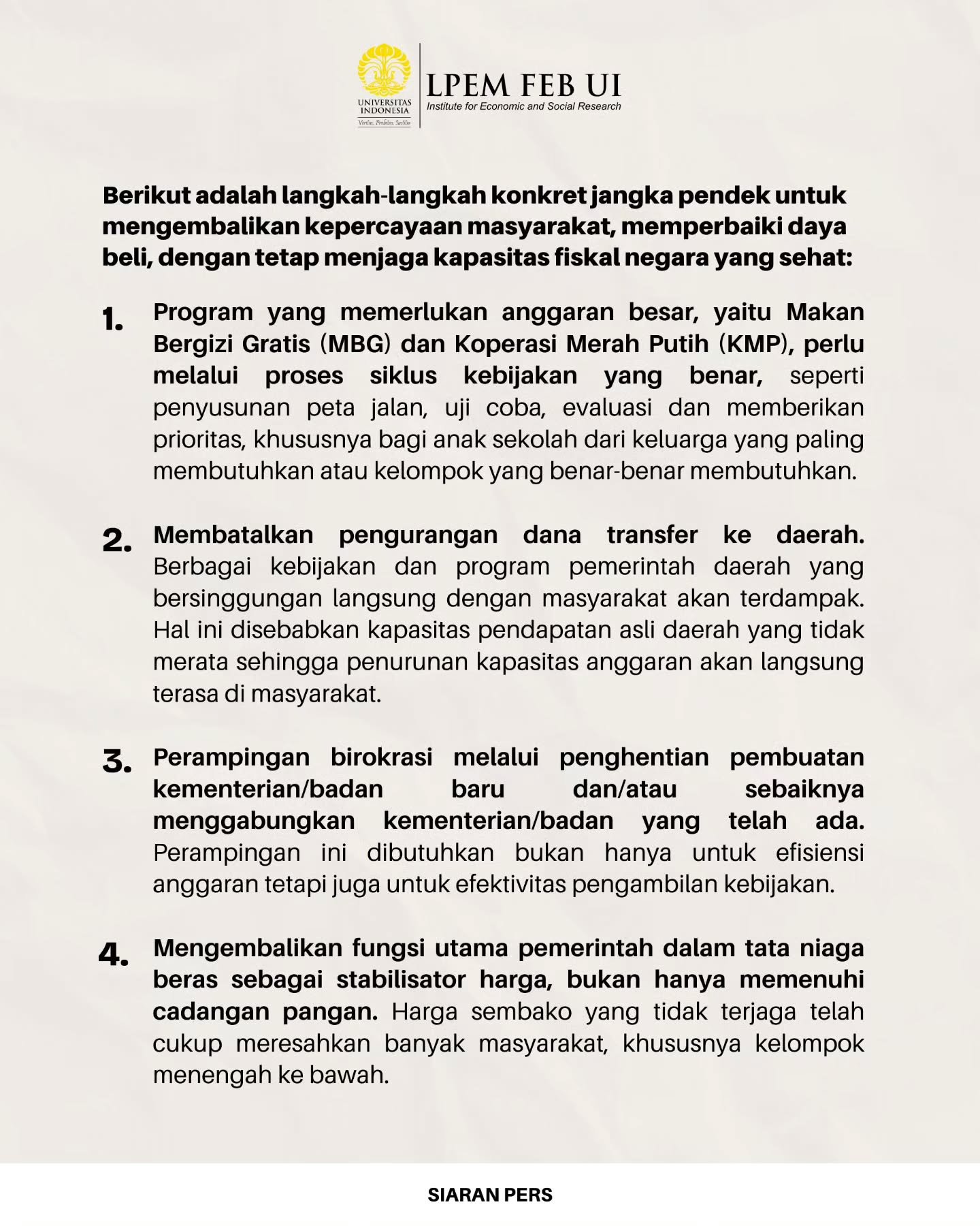 Berikut adalah langkah-langkah konkrit jangka pendek untuk mengembalikan kepercayaan masyarakat, memperbaiki daya beli, dengan tetap menjaga kapasitas fiskal negara yang sehat: