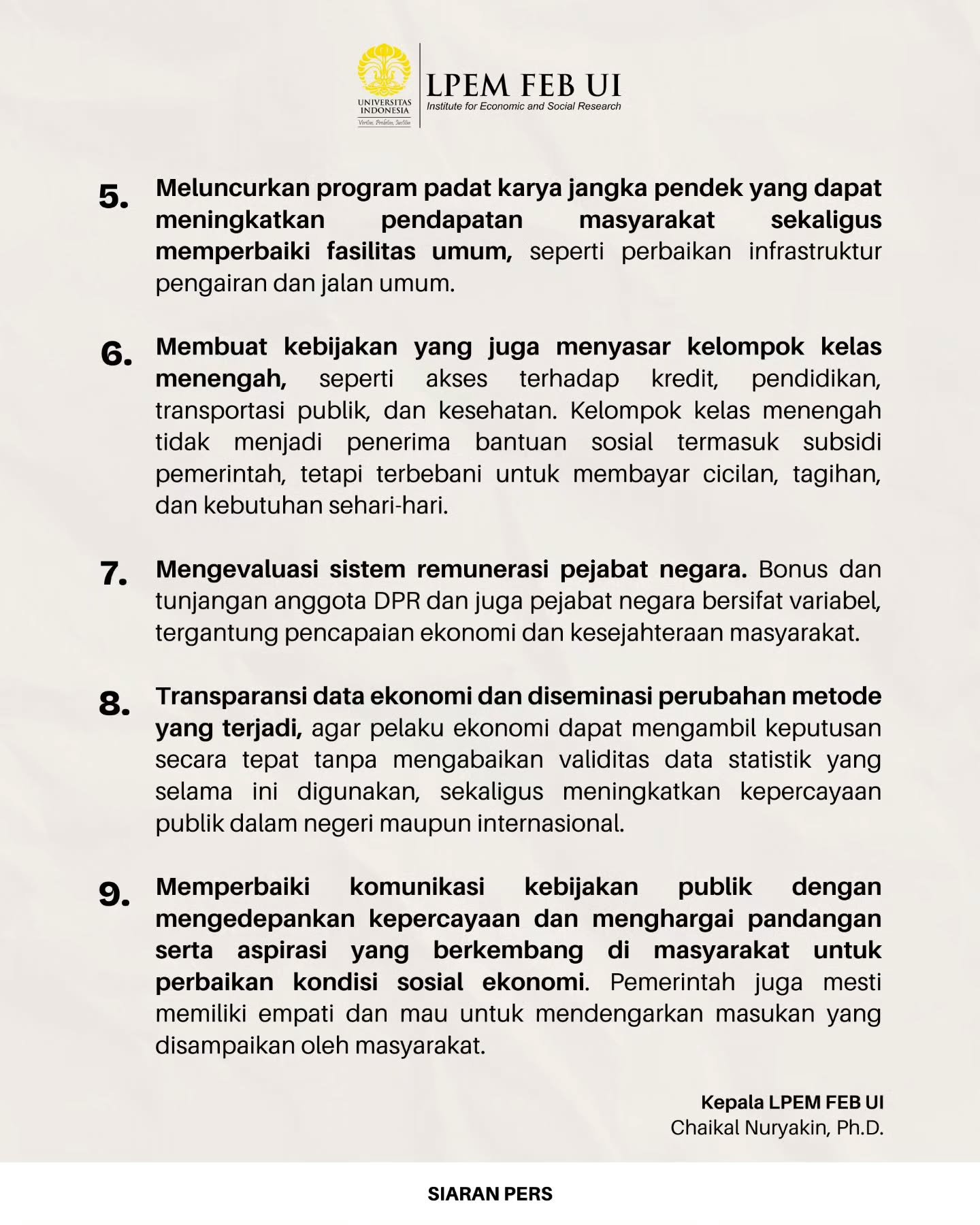 Lembaga Penyelidikan Ekonomi dan Masyarakat, Fakultas Ekonomi dan Bisnis Universitas Indonesia (LPEM-FEB UI) memiliki tanggung jawab moral untuk melihat dinamika yang terjadi dalam beberapa hari terakhir.