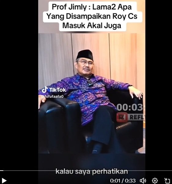 “Kalau saya perhatikan, saya denger juga kan, apa yang disampaikan oleh Roy Suryo-Rismon-Dokter Tifa, lama-lama masuk akal juga,” kata Prof. Jimly Asshiddiqie di podcast Refly Harun.