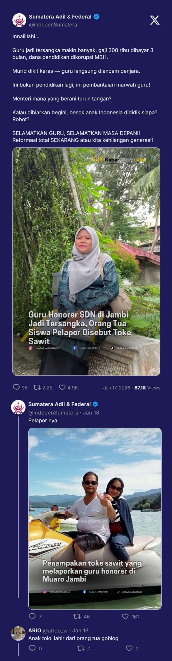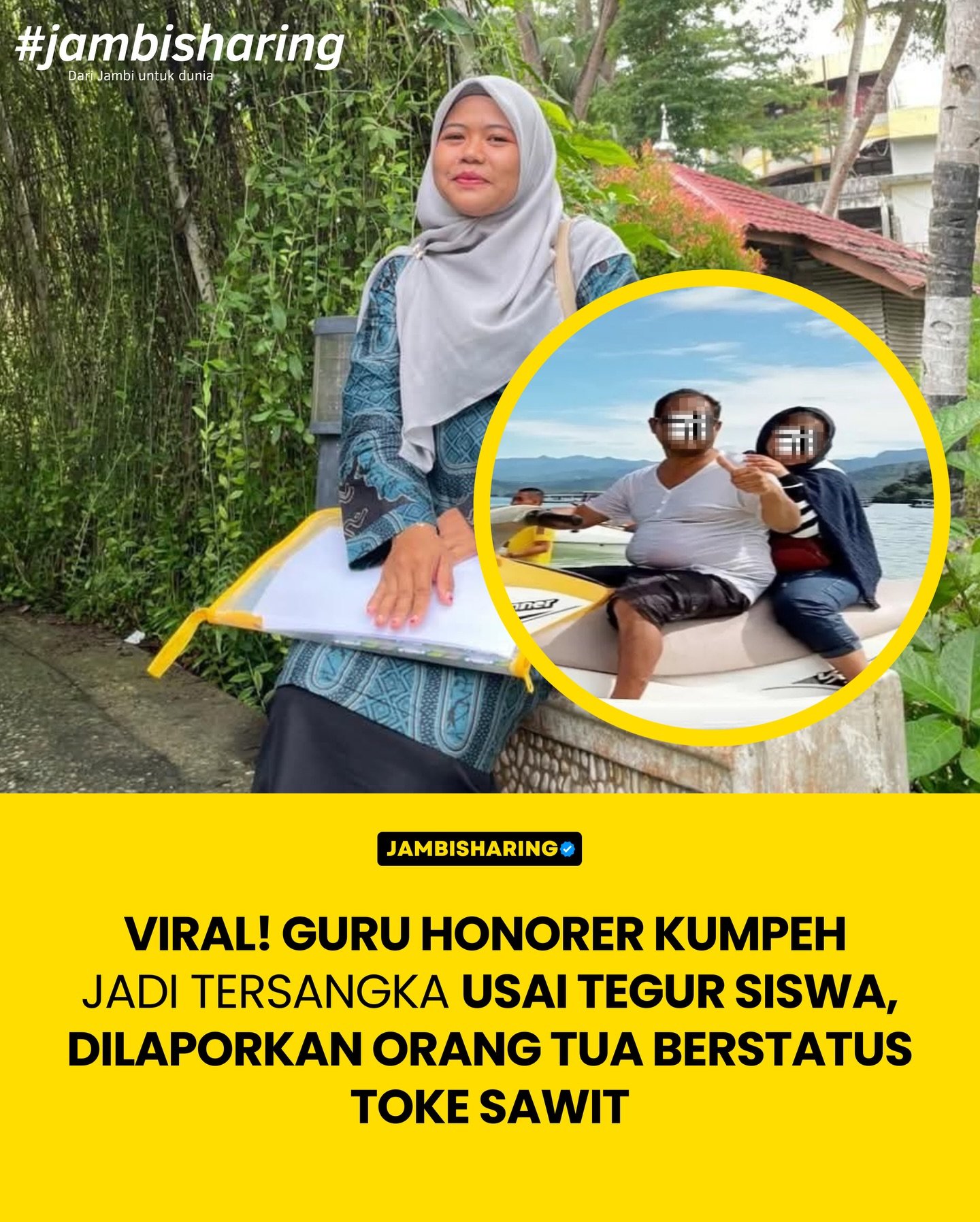 Seorang guru honorer SD Negeri di Kecamatan Kumpeh, Kabupaten Muaro Jambi, Tri Wulansari, S.Pd (34), ditetapkan sebagai tersangka usai dilaporkan orang tua siswa yang dikenal sebagai toke sawit.