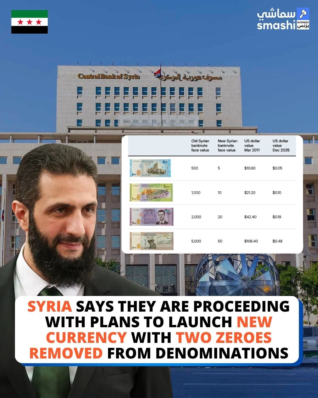 Bank Sentral Suriah telah mengkonfirmasi rencana untuk meluncurkan mata uang nasional baru, dengan menghilangkan dua angka nol dari pecahan mata uang dalam upaya untuk menyederhanakan transaksi dan memulihkan kepercayaan pada pound Suriah.
