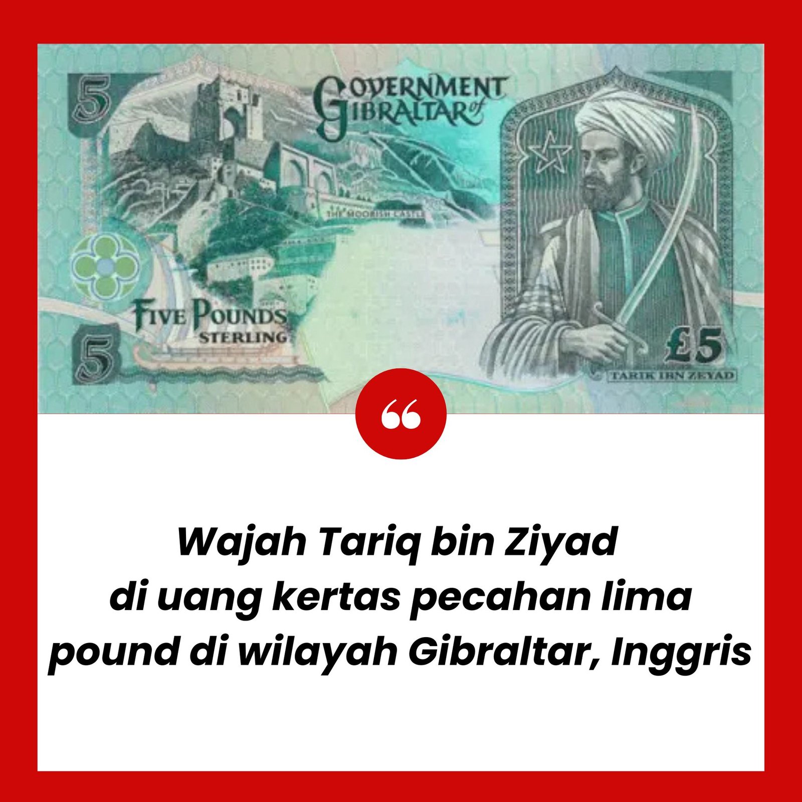 - Uang Kertas 5 Pound: Gibraltar memang memiliki mata uang sendiri (Pound Gibraltar) yang dipatok setara dengan Pound Sterling. Pada seri tahun 1995 hingga 2010-an, wajah Tariq bin Ziyad memang ditampilkan sebagai tokoh utama pada pecahan £5.