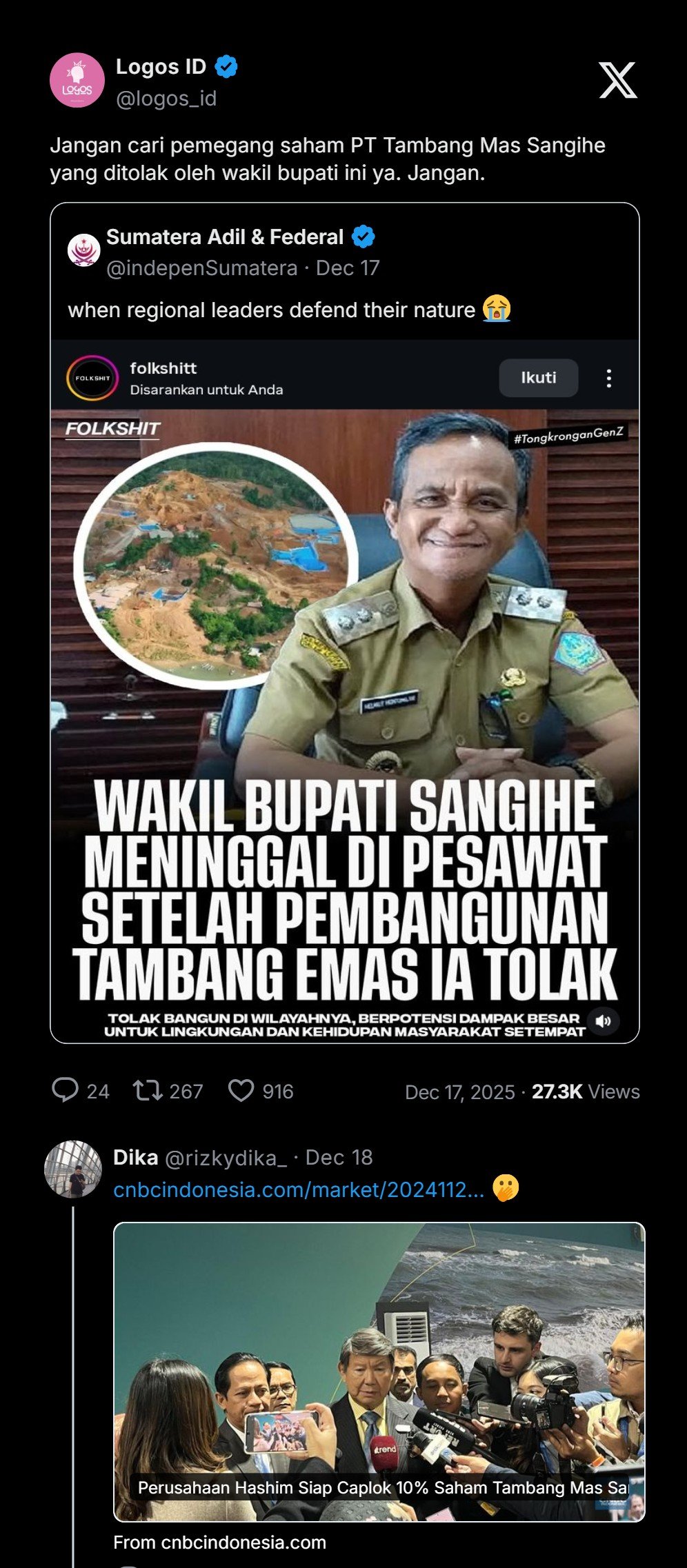 “Jangan cari pemegang saham PT Tambang Mas Sangihe yang ditolak oleh wakil bupati ini ya. Jangan,” sentil akun X @logos_id.