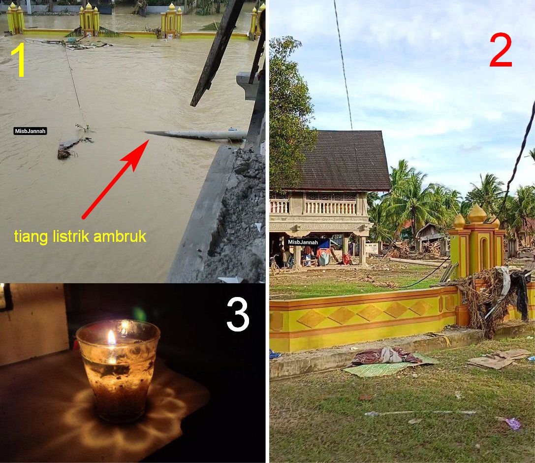 Foto pertama dan kedua penampakan tiang listrik yang tumbang saat banjir bandang dan setelah banjir.