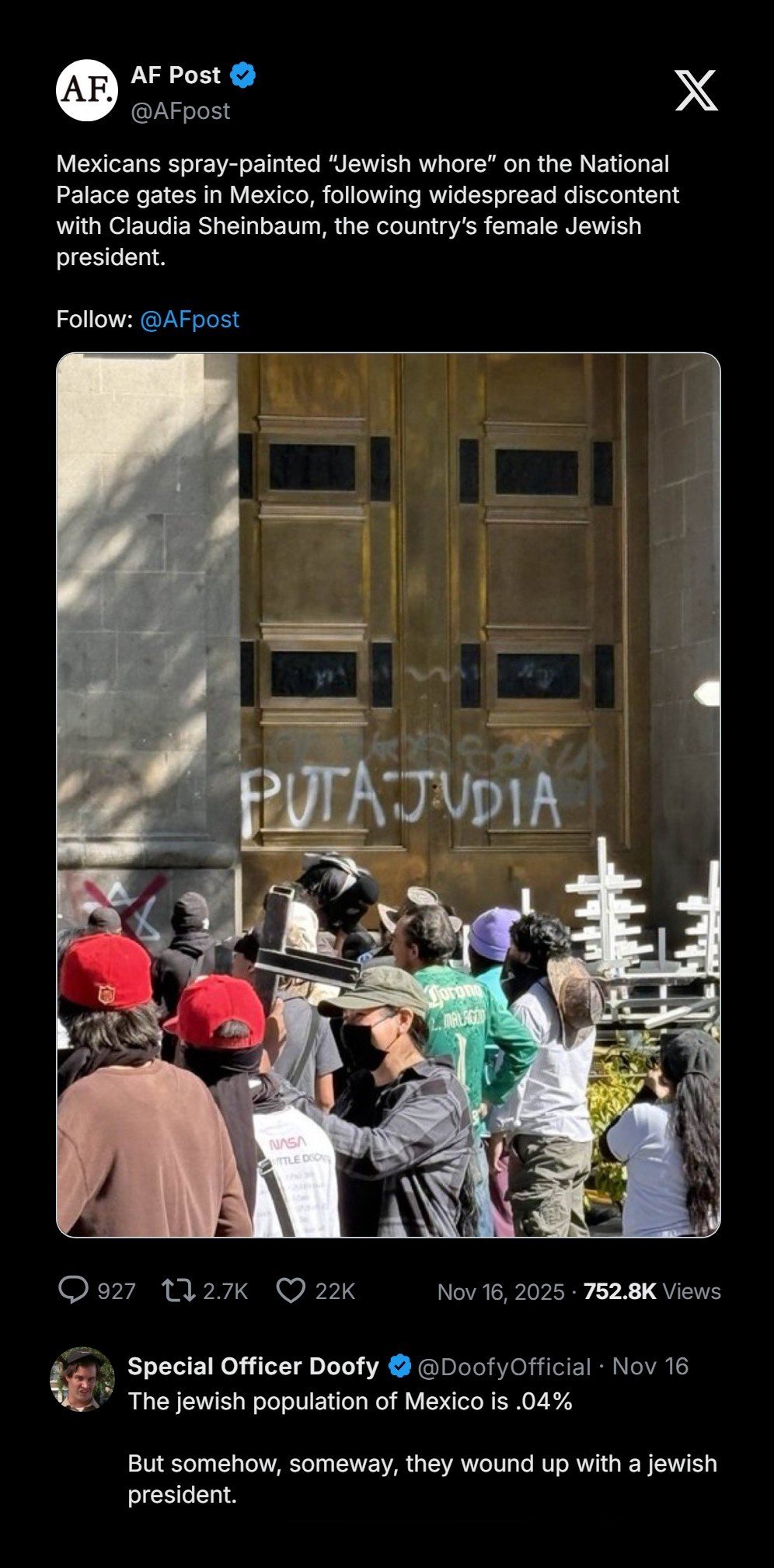 Warga Meksiko menyemprotkan cat bertuliskan “PUTA JUDIA” (“Pelacur Yahudi”) di gerbang Istana Negara Meksiko, menyusul ketidakpuasan yang meluas terhadap Claudia Sheinbaum, presiden perempuan Yahudi negara tersebut.