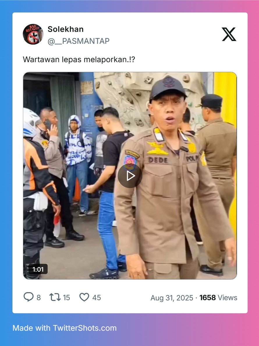 Wartawan lepas melaporkan langsung LIVE dari lokasi demo 😅AdminMinggu, 31 Agustus, 2025VIDEO Wartawan lepas melaporkan langsung LIVE dari lokasi demo 😅 VIDEONYA BIKIN KAGET [VIDEO] Wartawan lepas melaporkan.!? pic.twitter.com/xPssAIl8eO— Solekhan (@__PASMANTAP) August 30, 2025 Padahal lagi nggak OK tapi ngomongnya OK terus. Fix pendukung 02 ini OK gas😀— REF (@ariefrahmanovic) August 31, 2025 Jangan LewatkanAktor penjual tanah airKemenhut bilang tumbang alami, tapi kenapa potongannya rapi dan kayunya ada nomornya?7 jam bertahan akhirnya Ya AllahNGERI… Niat Bikin Parit Darurat, Jalan di Aceh Justru Amblas Kian ParahKOCAK Prabowo vs Prabowo 🤣Pak Prabowo….
