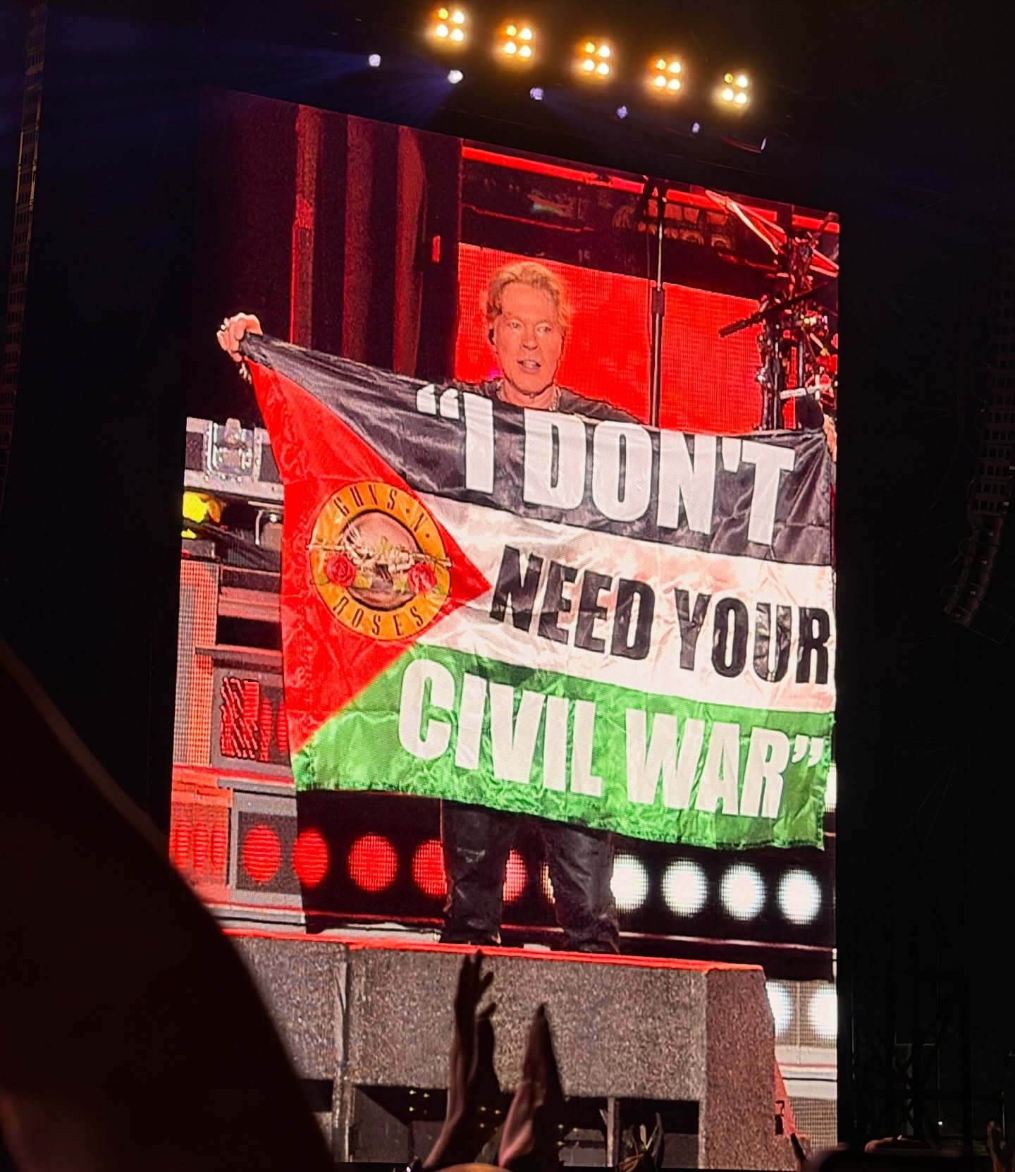 Dalam bendera Palestina terlihat logo Guns N’ Roses dan tulisan I DON’T NEED YOUR CIVIL WAR, yang merupakan penggalan lirik lagi GNR Civil War.
