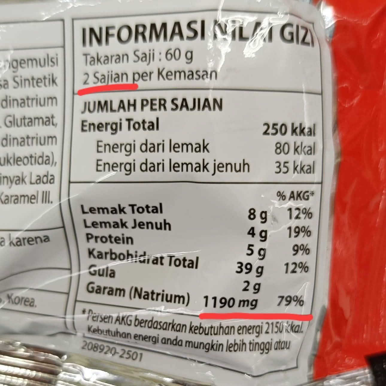 Mie ini menampilkan data natrium sebesar 1190 mg yang sudah menghabiskan 79% jatah konsumsi garam satu hari. Tapi lihat data di bagian atas, data yang tertera itu adalah untuk 1 sajian, sedangkan total sajian perkemasan itu 2 sajian.