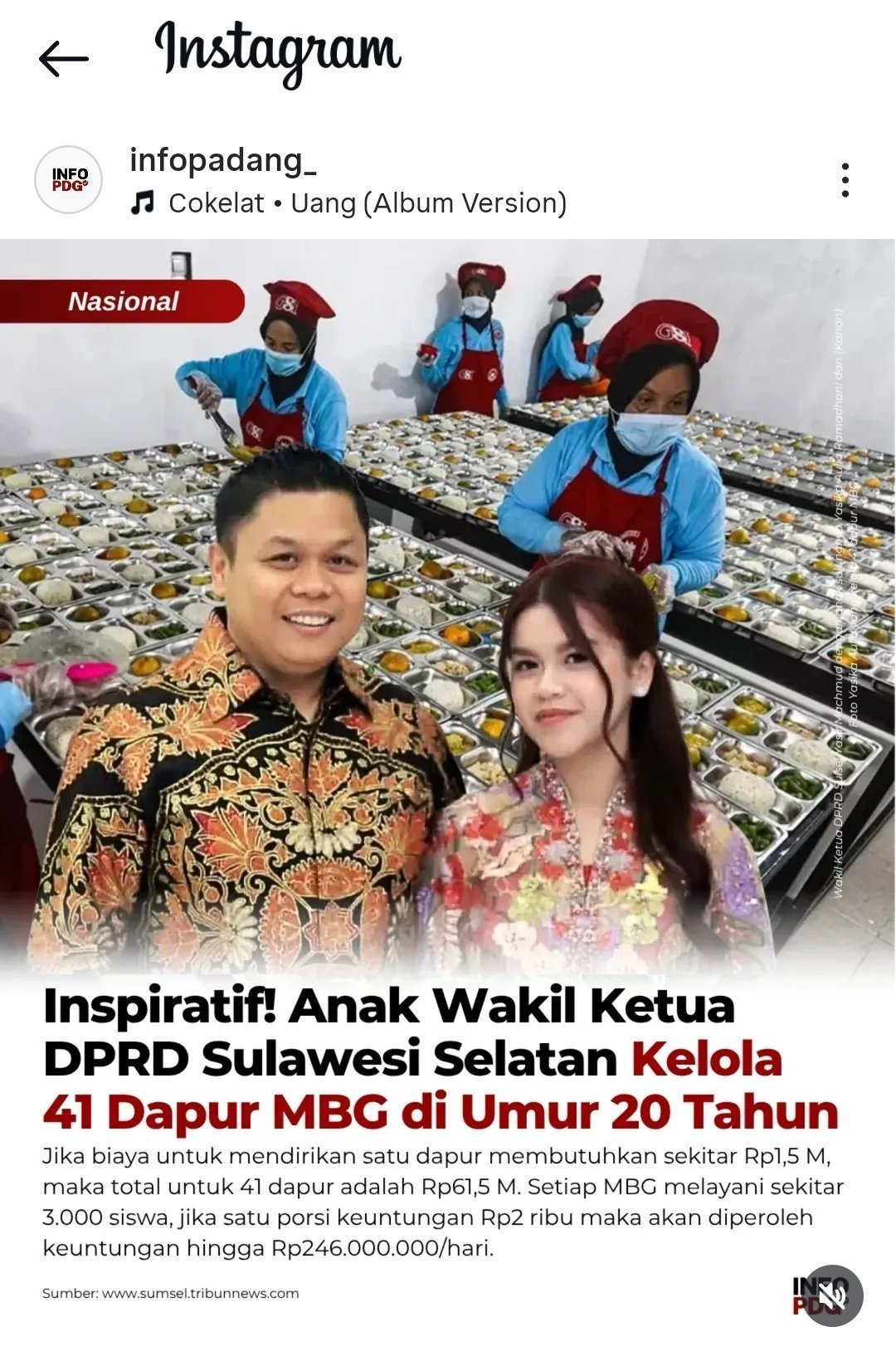 Sebagai informasi, BGN punya aturan untuk mitra program MBG: satu yayasan hanya boleh mengelola 10 dapur MBG. Sementara Yasika Aulia Ramadhani anak dari Yasir Machmud ini memiliki 41 dapur MBG dari beberapa yayasan yang berbeda.