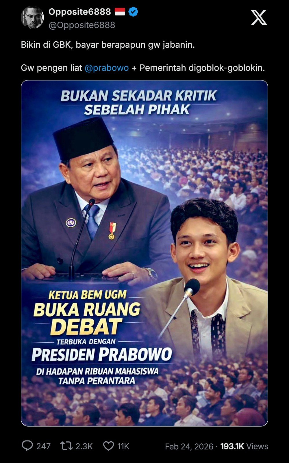 “Bikin di GBK, bayar berapapun gw jabanin. Gw pengen liat @prabowo + Pemerintah digoblok-goblokin,” cuit akun X @Opposite6888.