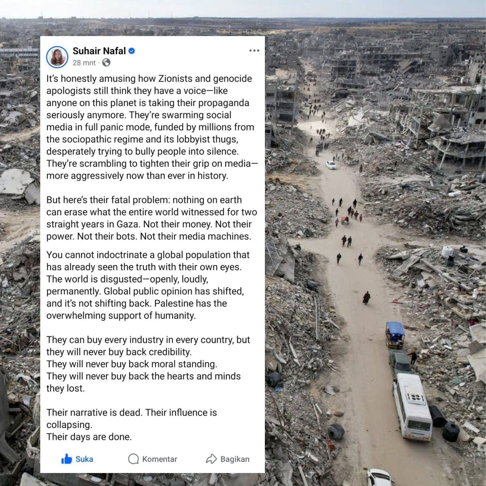 Namun inilah masalah fatal mereka: tak ada di bumi ini yang bisa menghapus apa yang disaksikan seluruh dunia selama dua tahun berturut-turut di Gaza. Uang mereka, kekuasaan mereka, bot mereka, mesin media mereka, tidak ada yang bisa.